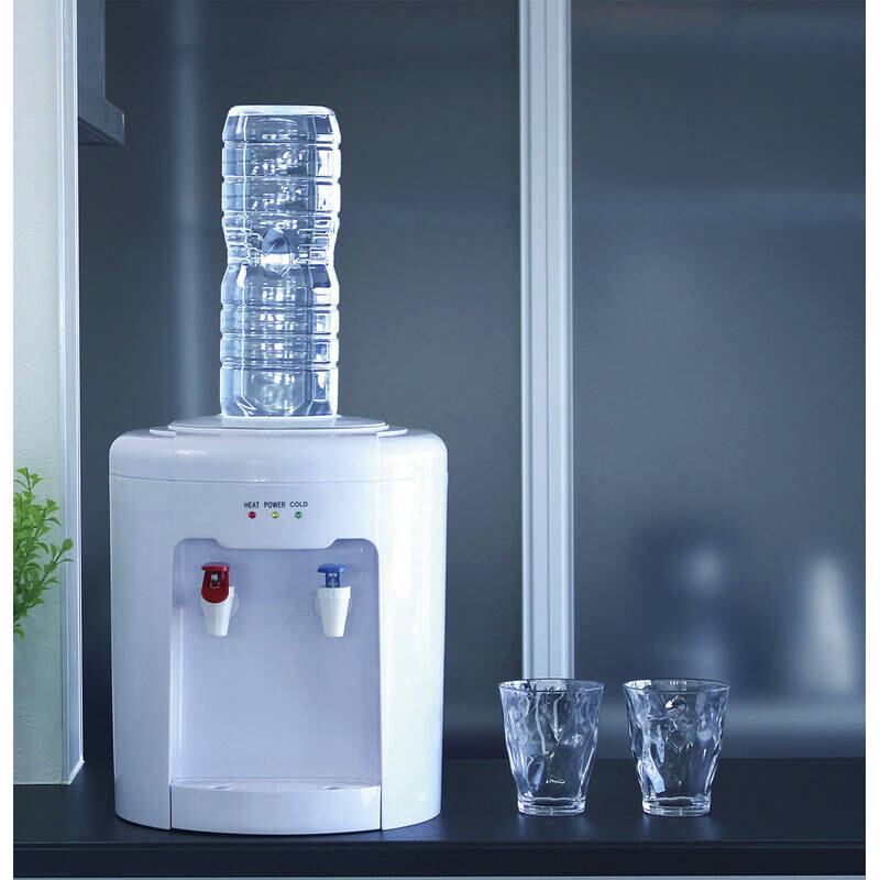 市販のペットボトル2Lを装着使用の温冷両用ウォーターサーバー・空焚き防止機能付き・温水用レバーには安全機能付き・ECOボトル使用不可・温水:85℃~95℃、冷水:10℃~15℃・温水:670mL・冷水:500mL
