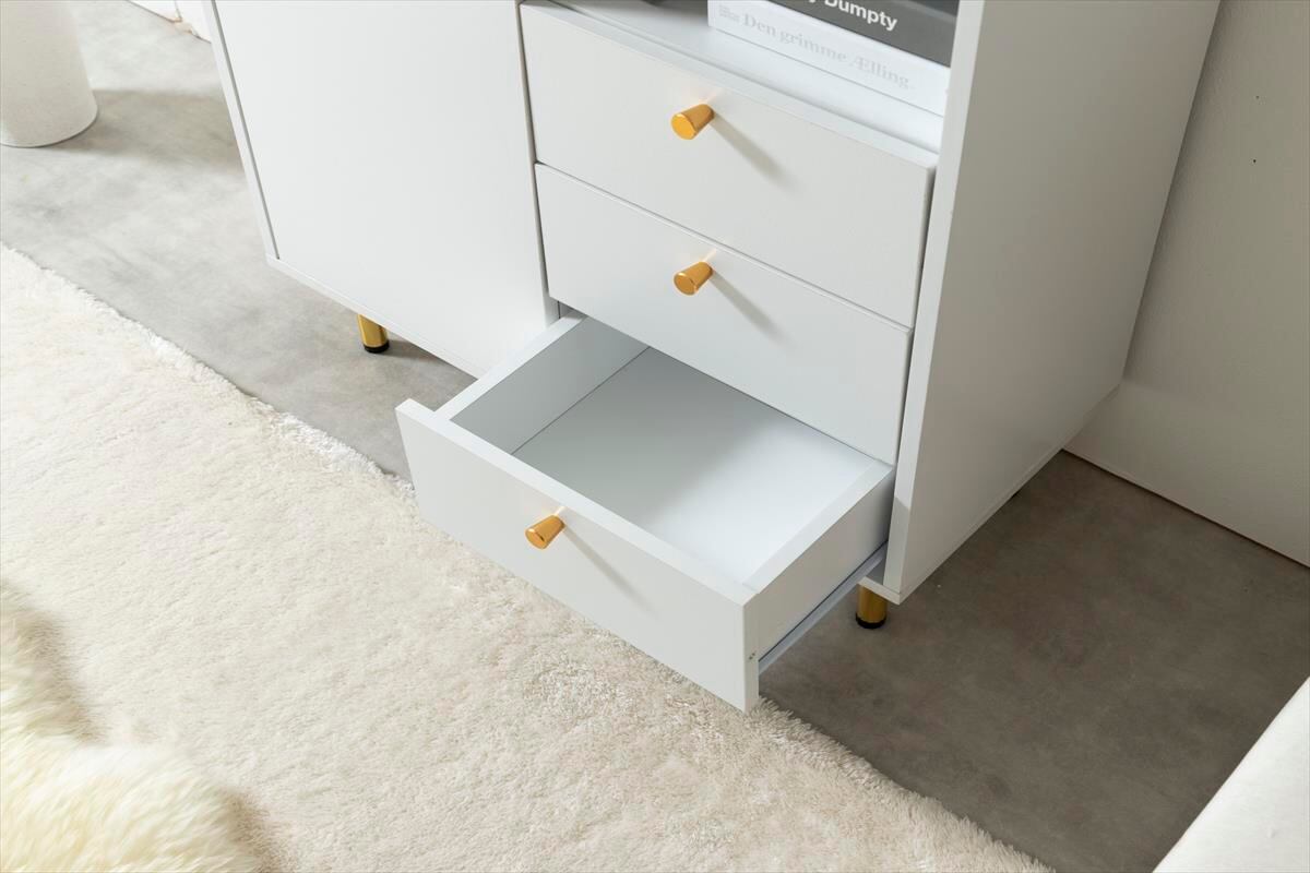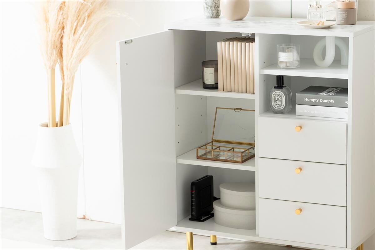 天板の大理石柄とゴールドのあしらいが特徴の『Camila(カミラ)』シリーズのキャビネット